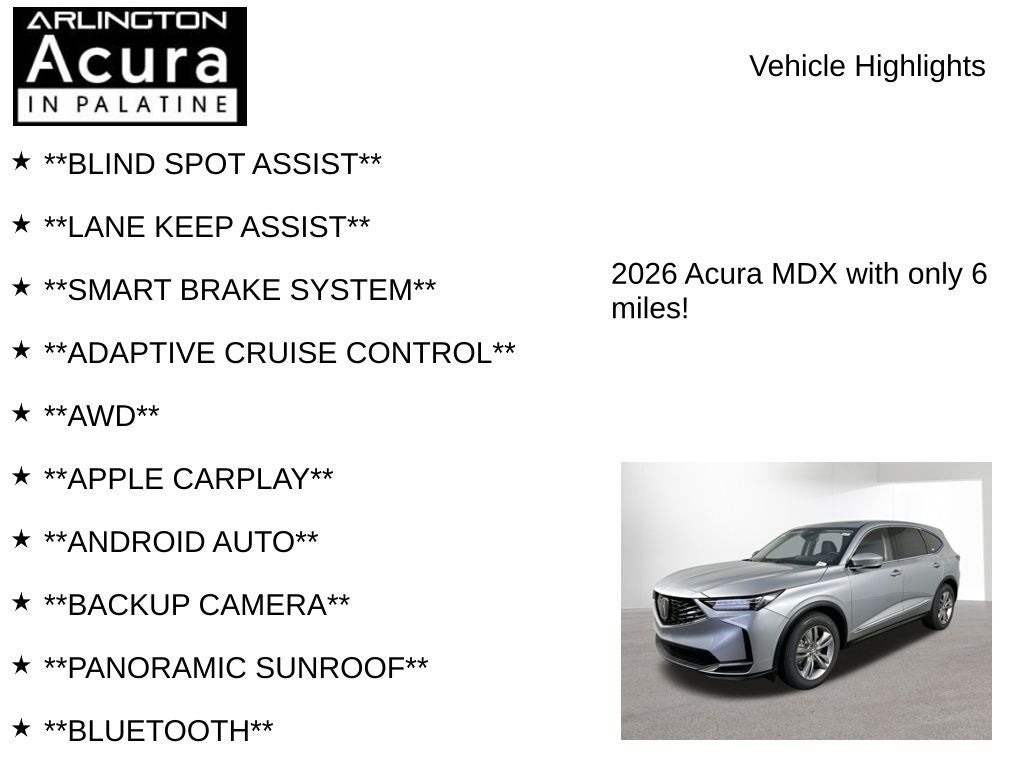 Experience the pinnacle of luxury and performance with the 2026 Acura MDX Base SH-AWD. Prepare to be captivated by its exceptional design, cutting-edge technology, and uncompromising capability. Visit our showroom today and let us demonstrate how this remarkable SUV can elevate your driving experience to new heights.